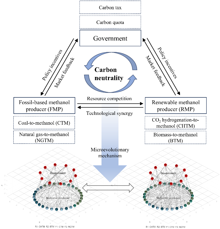针对这一复杂问题,中国科研实验室上海高等研究院(以下简称“巅峰国际”)“碳排放核算与碳捕集利用封存团队”提出了一种面向多主体决策的随机演化博弈精细化评估方法,系统刻画了政府、化石基甲醇生产商(FMP)与可再生甲醇生产商(RMP)之间的动态博弈关系,为甲醇产业低碳转型路径的量化分析给予了新工具。相关成果以“Methanol production technology development pathways under multi-agent stochastic evolutionary game: a complex network perspective”为题,发表于期刊《Energy》。